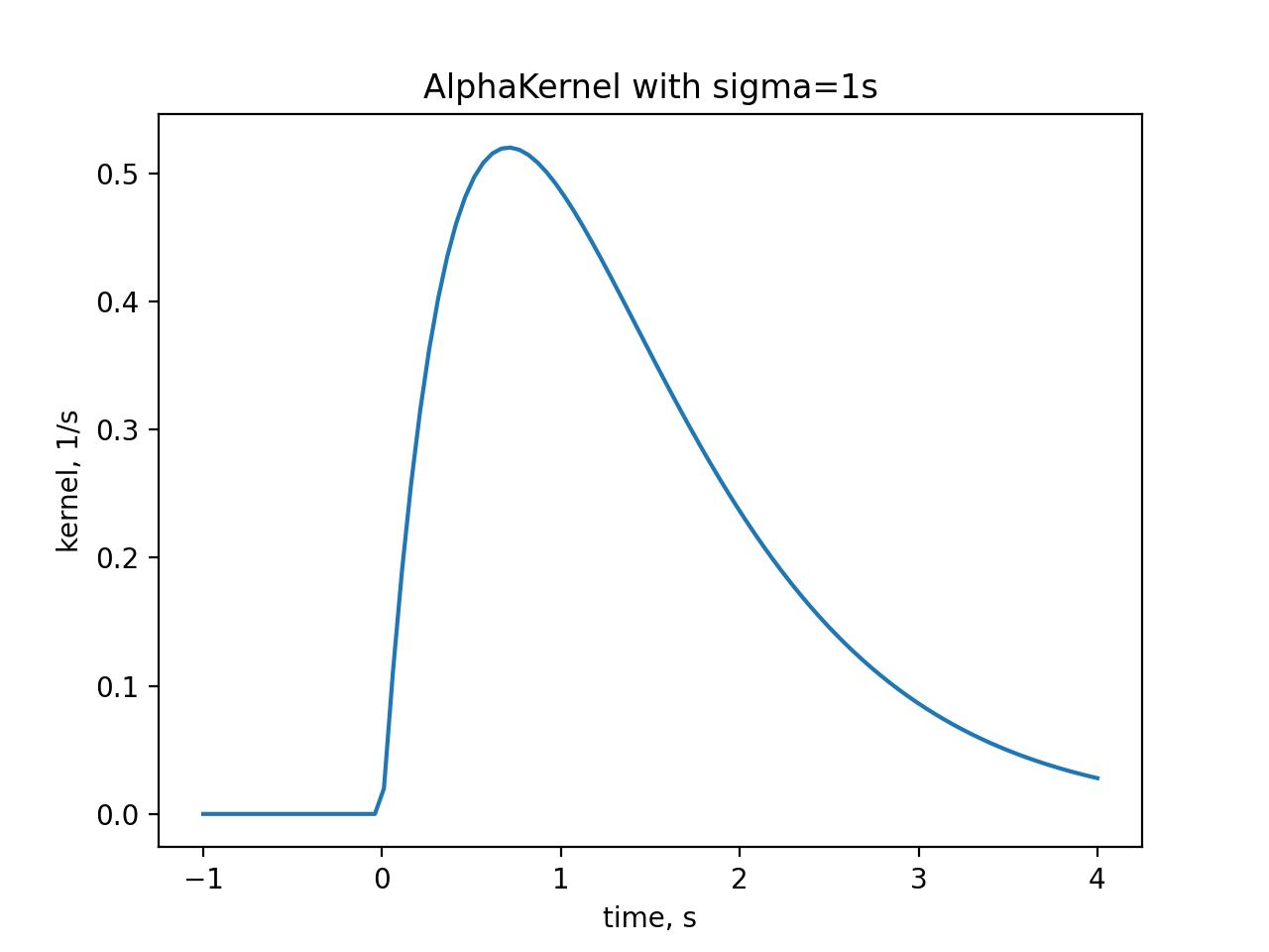 from elephant import kernels import quantities as pq import numpy as np import matplotlib.pyplot as plt time_array = np.linspace(-1, 4, num=100) * pq.s kernel = kernels.AlphaKernel(sigma=1*pq.s) kernel_time = kernel(time_array) plt.plot(time_array, kernel_time) plt.title("AlphaKernel with sigma=1s") plt.xlabel("time, s") plt.ylabel("kernel, 1/s") plt.show()