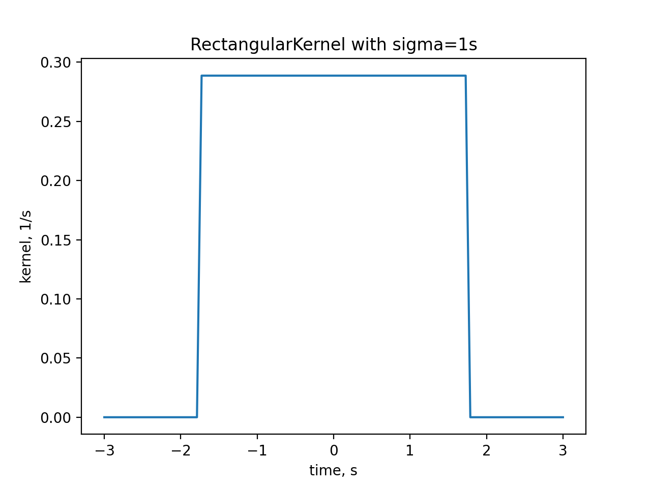 from elephant import kernels import quantities as pq import numpy as np import matplotlib.pyplot as plt time_array = np.linspace(-3, 3, num=100) * pq.s kernel = kernels.RectangularKernel(sigma=1*pq.s) kernel_time = kernel(time_array) plt.plot(time_array, kernel_time) plt.title("RectangularKernel with sigma=1s") plt.xlabel("time, s") plt.ylabel("kernel, 1/s") plt.show()