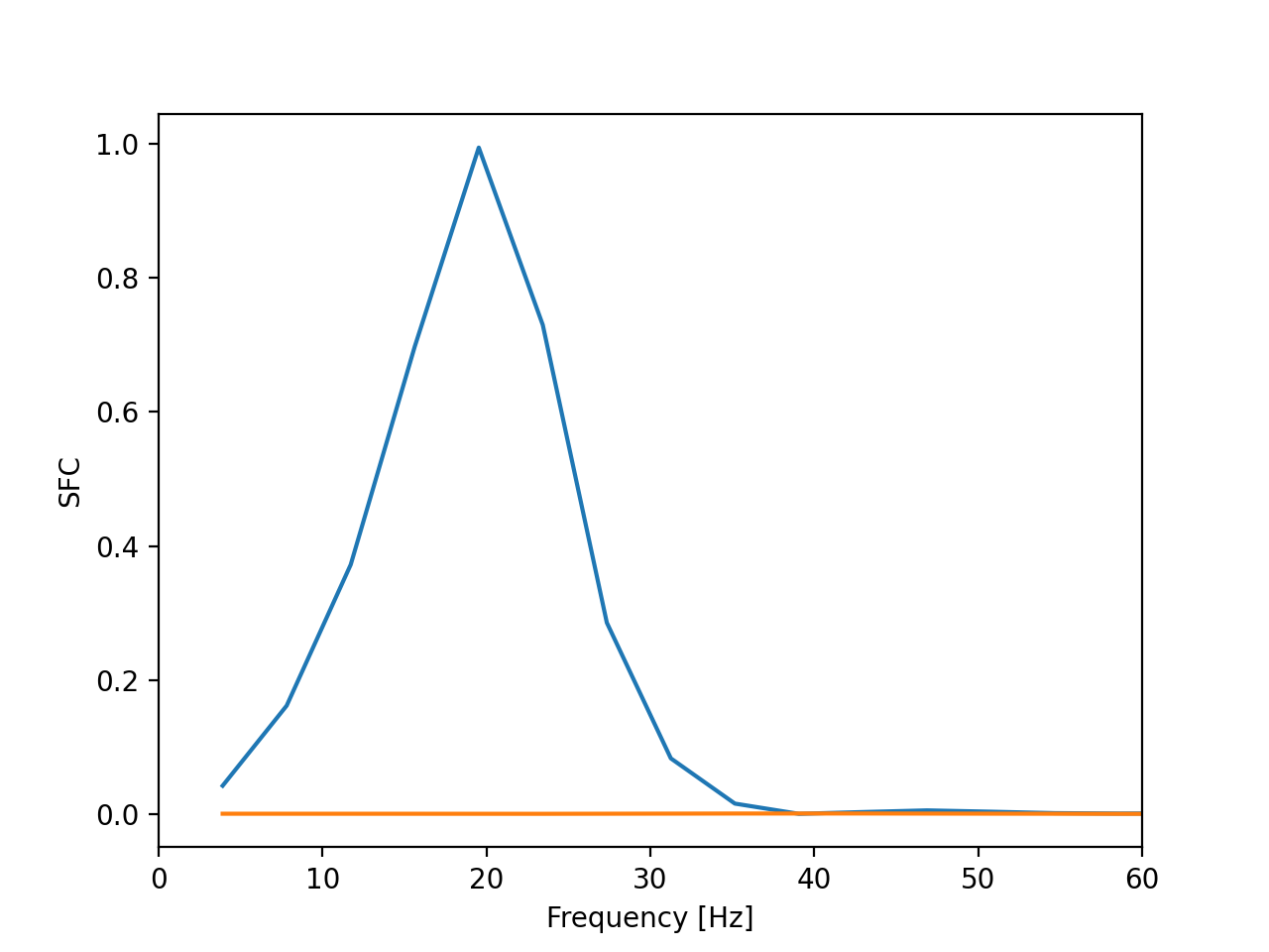 import numpy as np import matplotlib.pyplot as plt import quantities as pq from quantities import s, ms, mV, Hz, kHz import neo, elephant t = pq.Quantity(range(10000),units='ms') f1, f2 = 20. * Hz, 23. * Hz signal = neo.AnalogSignal(np.array([ np.sin(f1 * 2. * np.pi * t.rescale(s)), np.sin(f2 * 2. * np.pi * t.rescale(s))]).T, units=pq.mV, sampling_rate=1. * kHz) spiketrain = neo.SpikeTrain( range(t[0], t[-1], 50), units='ms', t_start=t[0], t_stop=t[-1]) sfc, freqs = elephant.sta.spike_field_coherence( signal, spiketrain, window='boxcar') plt.plot(freqs, sfc[:,0]) plt.plot(freqs, sfc[:,1]) plt.xlabel('Frequency [Hz]') plt.ylabel('SFC') plt.xlim((0, 60)) plt.show()